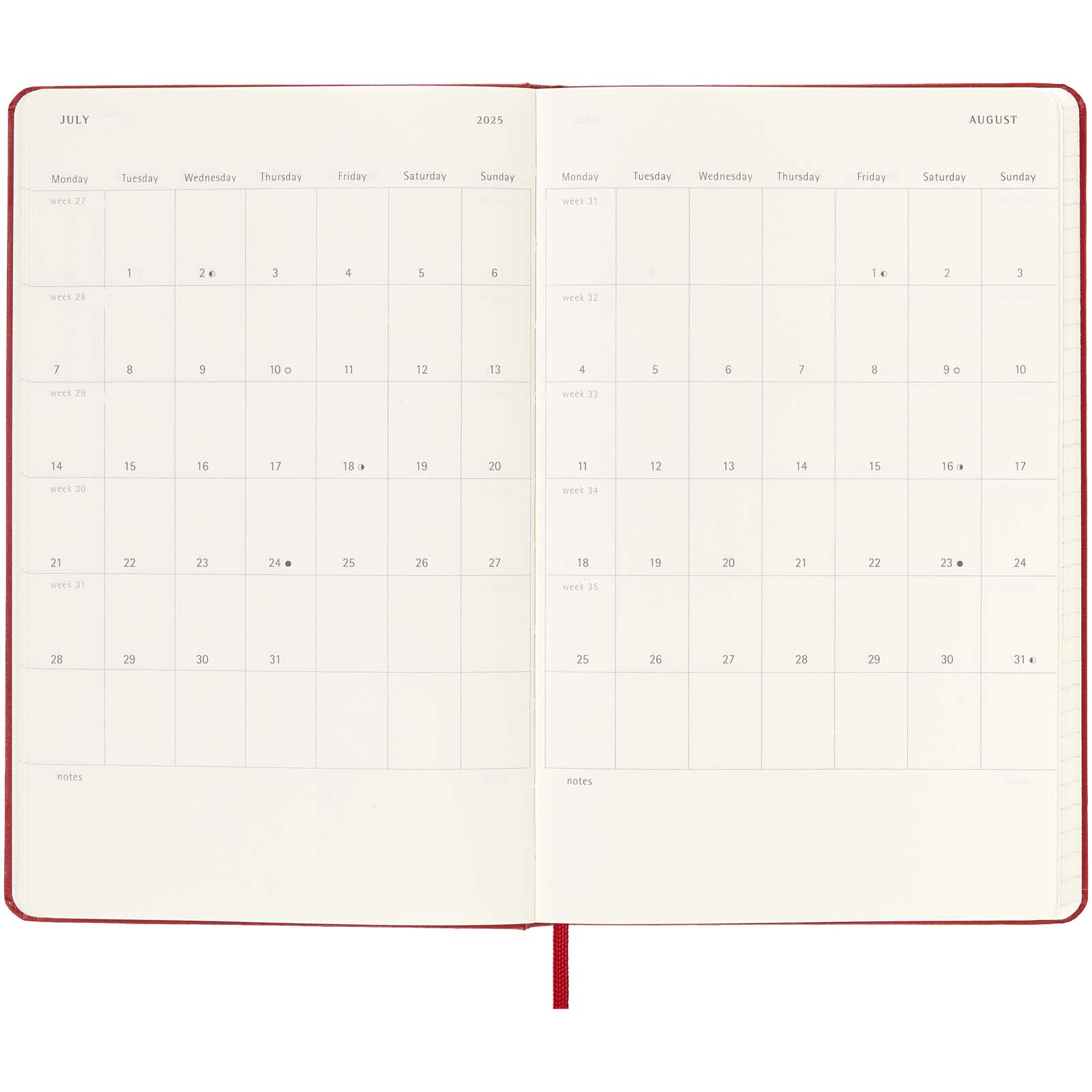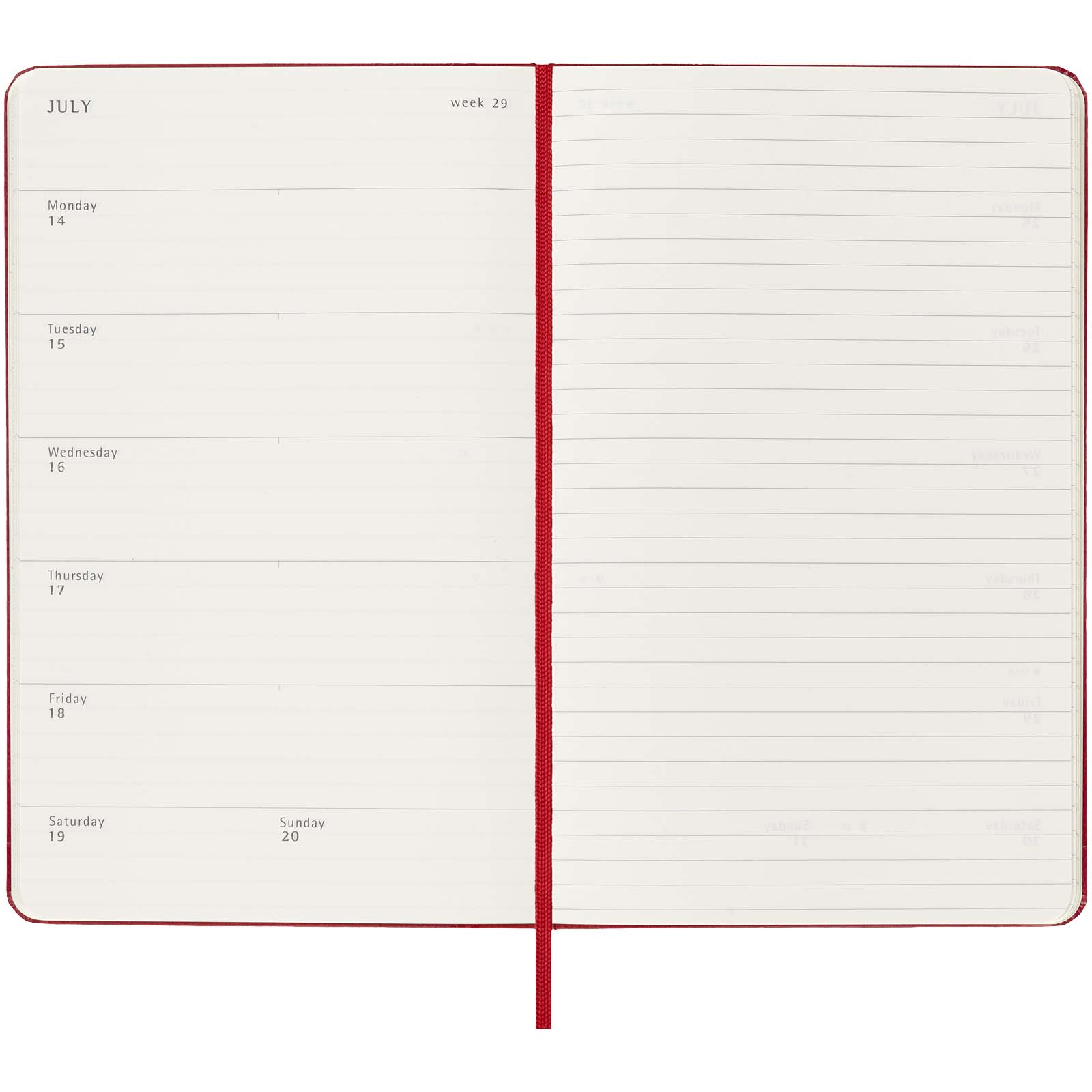 Agenda settimanale 12 mesi formato L con copertina rigida Moleskine Con durata gennaio-dicembre 2026, l’agenda settimanale 12 mesi Moleskine con copertina rigida mostra l’intera settimana a colpo d’occhio, oltre a pagine con panoramica annuale e mensile per una visione più ampia dell’anno, seguite da pagine per la pianificazione di viaggi, idee e obiettivi. I giorni di ogni settimana sono indicati su un lato, mentre a destra è presente una pagina a righe per impegni e appunti. Dispone di una carta priva di acidi color avorio, una chiusura con elastico nero, un segnalibro a nastro, una tasca interna espandibile in colore coordinato, adesivi per la personalizzazione e adesivi dell’anno per il dorso. Carta pergamena. FSC Mix Credit P7.1 CU-COC-877277. Colori: Nero – Scarlatto – Zaffiro – Verde Mirto Misura: cm 13×40 x 21,20 x 1,00