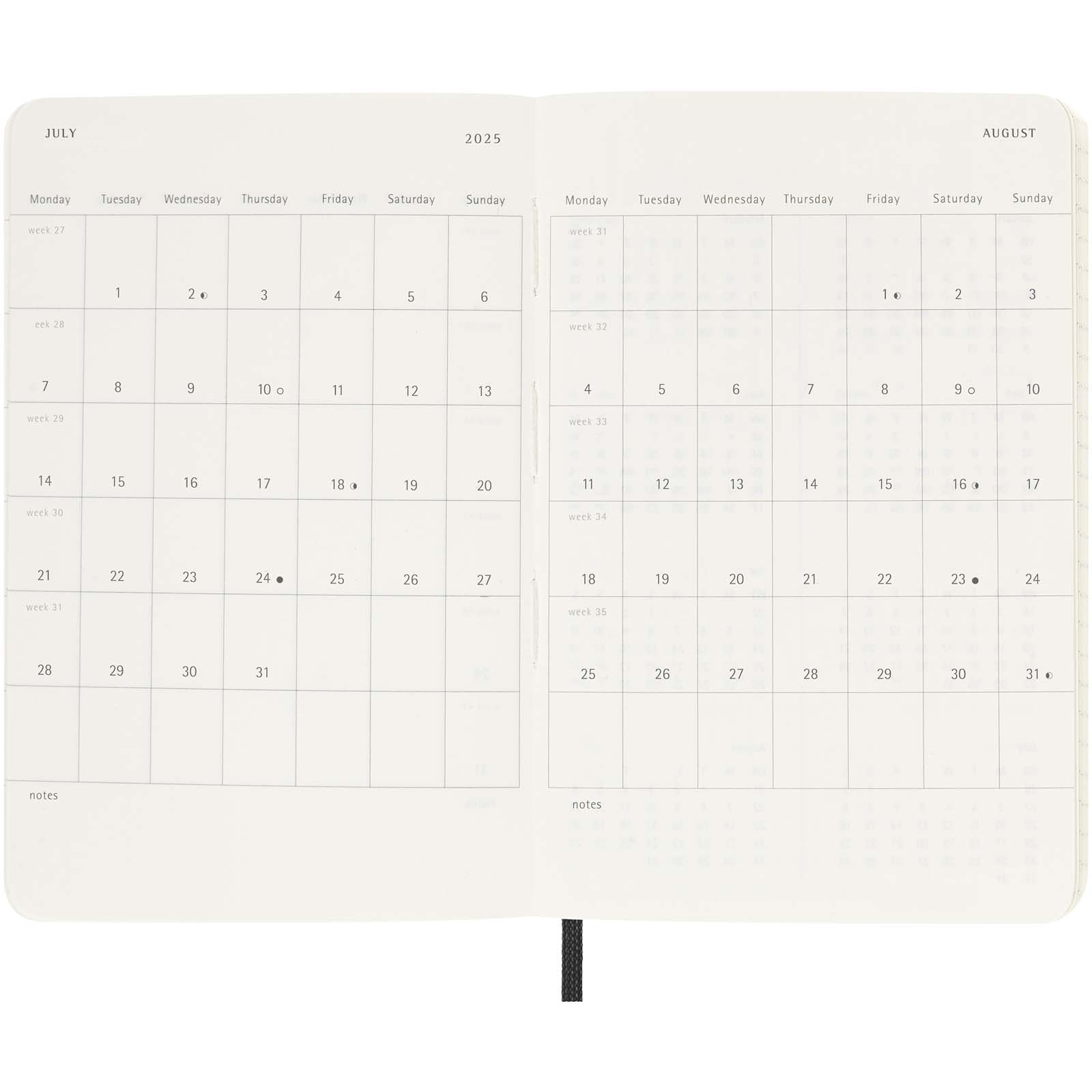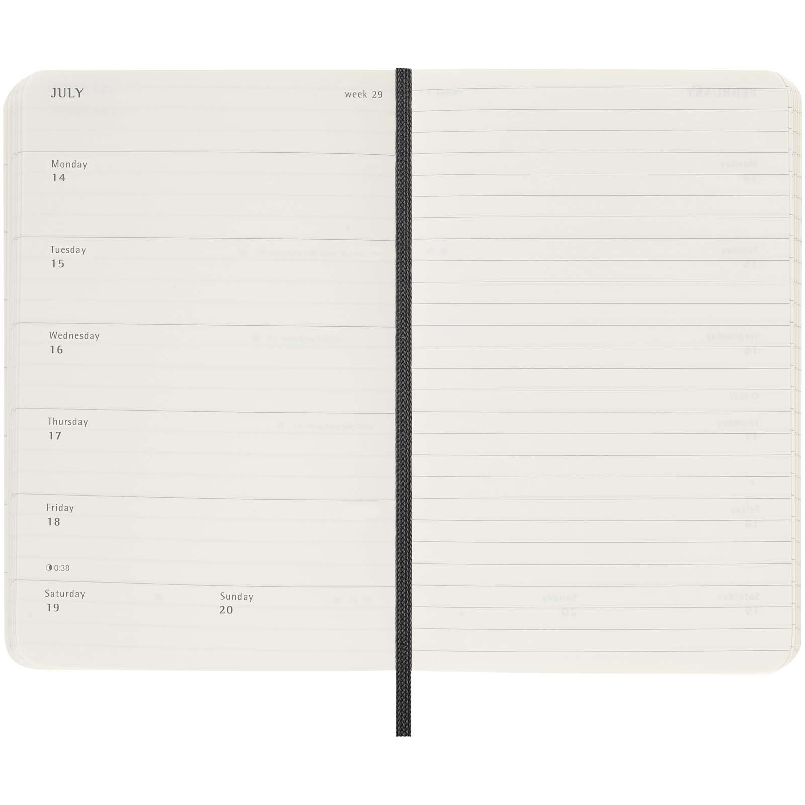 Agenda settimanale tascabile 12 mesi con copertina morbida Moleskine Con durata gennaio-dicembre 2026, l’agenda settimanale 12 mesi tascabile Moleskine con copertina morbida mostra l’intera settimana a colpo d’occhio, oltre a pagine con panoramica annuale e mensile per una visione più ampia dell’anno, seguite da pagine per la pianificazione di viaggi, idee e obiettivi. I giorni di ogni settimana sono indicati su un lato, mentre a destra è presente una pagina a righe per impegni e appunti. Dispone di una carta priva di acidi color avorio, una chiusura con elastico nero, un segnalibro a nastro, una tasca interna espandibile in colore coordinato, adesivi per la personalizzazione e adesivi dell’anno per il dorso. Carta certificata FSC.
