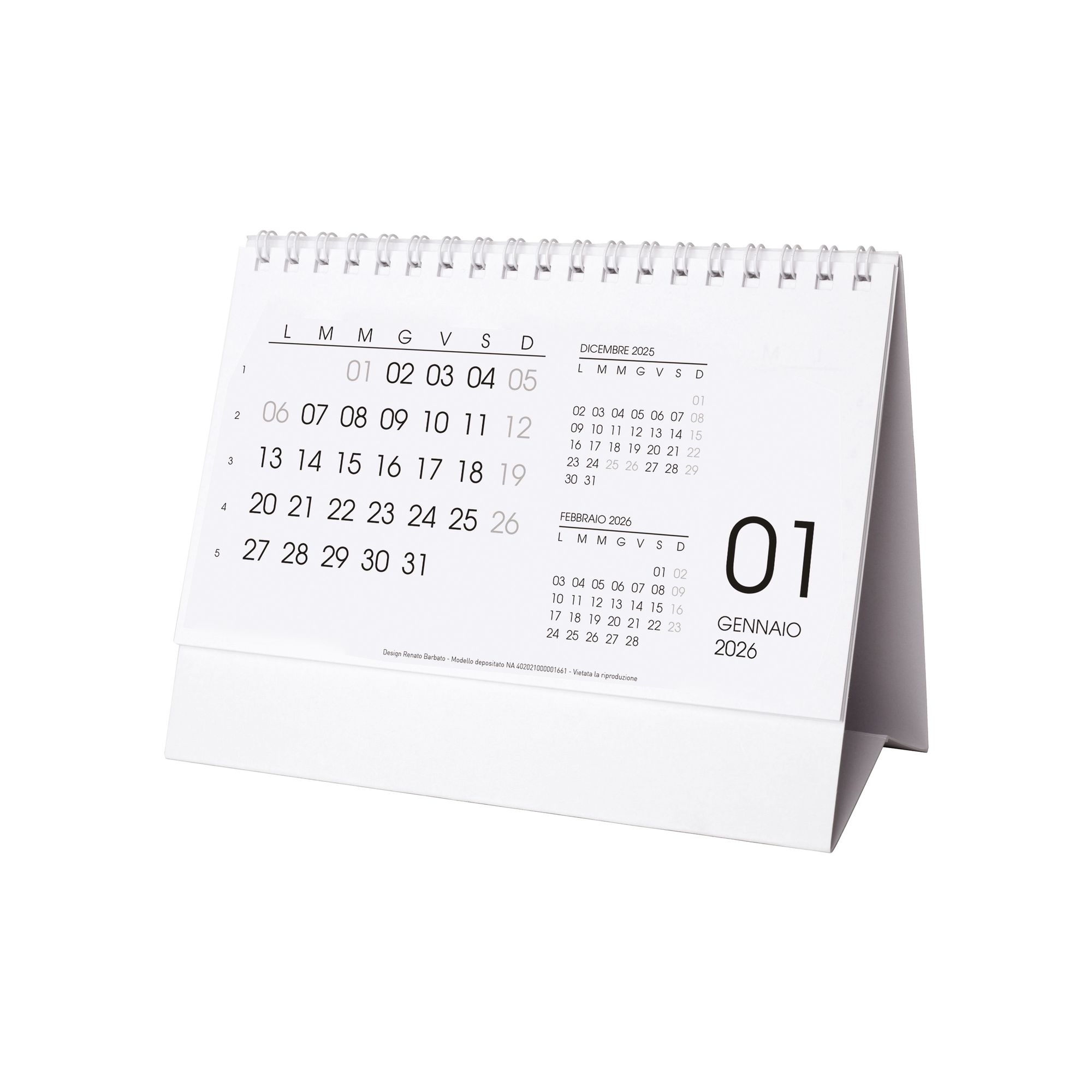 Calendario 2026 da tavolo mensile, 13 fogli su cartoncino bianco o nero, rilegato a spirale