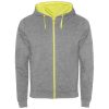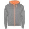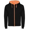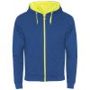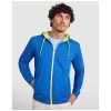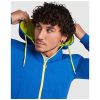 Felpa in pile non spazzolato con dettagli in colore fluorescente. Zip centrale con tiretto a contrasto. Cappuccio con fodera in tessuto di poliestere microforato e colore fluorescente a contrasto. Cordoncino e occhielli metallici in colore fluorescente a contrasto. Polsini e vita a coste 1×1. Due tasche anteriori con ampio bordo. Cuciture coperte e rinforzate all’interno del colletto. Etichetta rimovibile. 60% Cotone e 40% Poliestere, 280 g/m2.